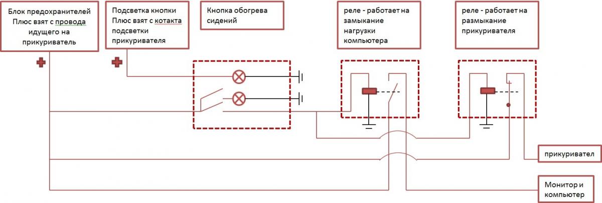 Я не стал идти путем включения компьютера с зажигание. Пошел по простому пути, нужен компьютер включил, ненужен выключил. Отсюда вся концепция разводки питания. В принципе ничего сложного, вот небольшую схемку набросал (минус сведен в одном месте):