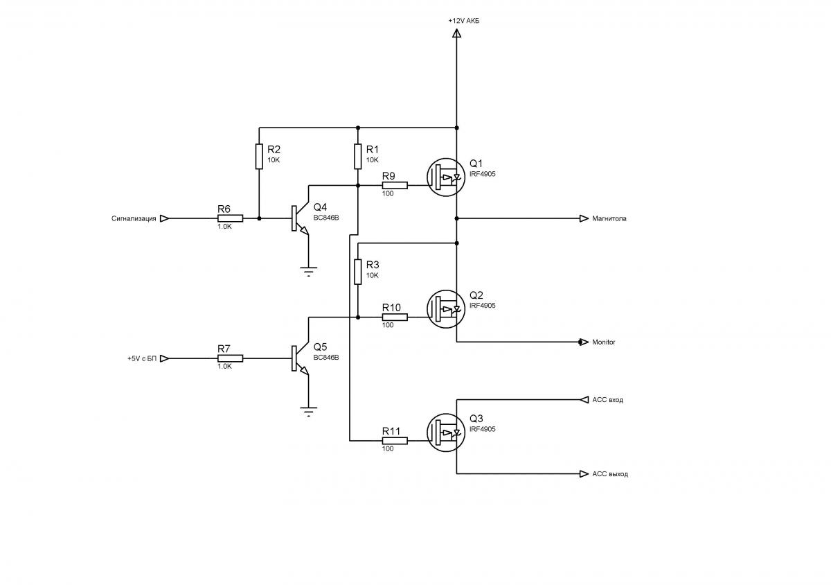 Алгоритм такой когда охрана включена (вход сигнализация закорочен на "-") транзистор закрыт после снятия с охраны транзюк Q4 открывается поступает напряжение на управляющий вход магнитолы(соответственно включается майфун), при включении БП компа поступает напряжение на вход +5V включается монитор. Также в режиме охраны ACC на входе компьютерного БП будет обесточиваться через транзистор Q3 для того чтоб комп на автозапуске не включался.