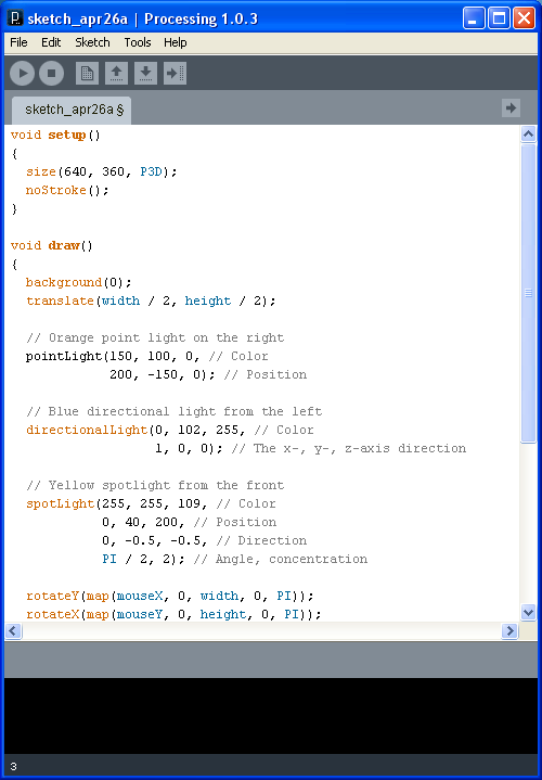 Я не ставил себе задачи научить кого-либо основам этого языка. В этом нет необходимости, ведь на оффсайте помимо подробнейшего мануала, есть несколько статей, в которых очень доступно, на простом английском языке обьясняются все азы и особенности работы с processing. Все описано очень подробно, есть даже иллюстрации. Также к вашим услугам и обширное коммюнити, представленное форумом с десятками тысяч постов.