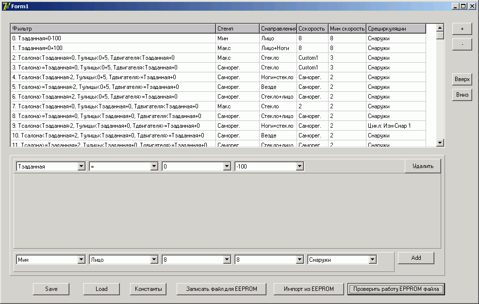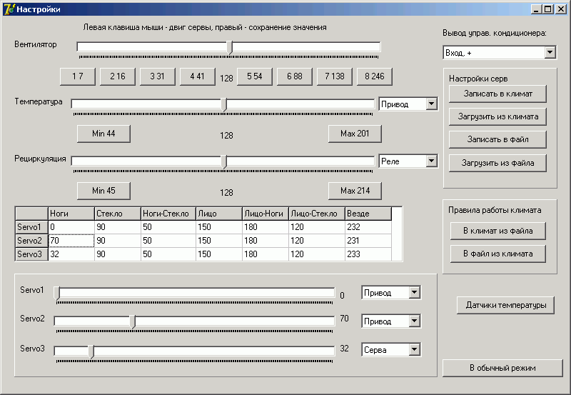 ну я еще сделал обдув стекол, чтобы стекла инеем не покрывались, пока двигатель не прогрет. Но это все уже не к прошивке относится, поскольку данные по тому когда и как дуть хранятся в eeprom и их можно менять с компьютера в спец. программе. В этой же программе можно задавать положения серв для различных направлений потоков воздуха, параметры вентилятора и прочее.