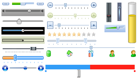 картинки можно добавлять на кнопки (+) , (-) и фоновый рисунок под всем трекбаром(гориз.линия). На (+) и (-) нужно 3-и картинки для каждой кнопки