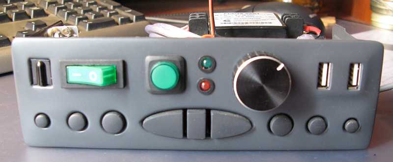 Второй ряд - ИК-приемник, кнопка вкл/выкл всей системы, кнопка вкл PC, диоды HDD и Power-led, Энкодер, два USB.