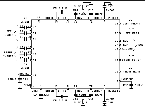 LP7313 имеет три стерео входа, коммутация которых происходит командой по шине I2C , в данном процессоре находится и эквалайзер, управляется он так же по шине I2C. С выхода аудио процессора через разделительные конденсаторы (отмеченые красным цветом) сигнал поступает на вход усилителя мощьности (TDA7381).