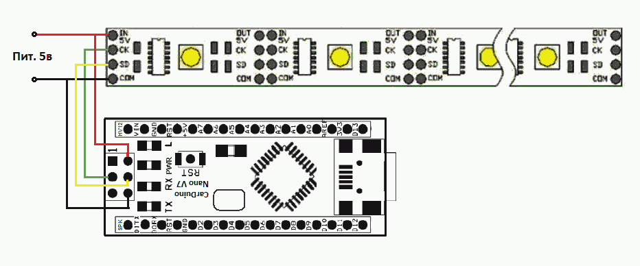 Первым делом кинулся ее проверять, но под рукой не оказалось мощного БП на +5в. Пришлось написать свой код проверки ленты с питанием от +5в Arduino Nano