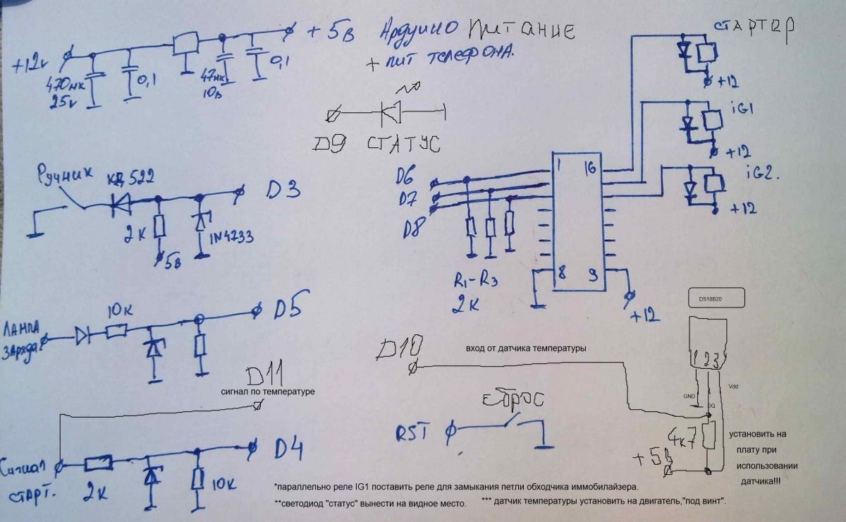 В связи со сменой машины озадачился автозапуском.На старой стоял отдельный модуль,интегрированный в сигналку.Было удобно.Озадачился поиском аналогичного,но на ардуино.Нашел такое решение https://sites.google.com/site/hobbya...home/car-start Воплотил в железе,залил код...на столе все работает.Сейчас дописываю в код дополнение для запуска по температуре.Датчик DS18B20.По ходу процесса душит "земноводное",т.к у nano остается не задействованы куча пинов,которые было бы можно использовать для своего блага.Во вложении код в текстовом формате,где я подробно закоментировал все строчки кода /для понимания его работы/.У знатоков прошу проверить раздел работы кода по датчику температуры.