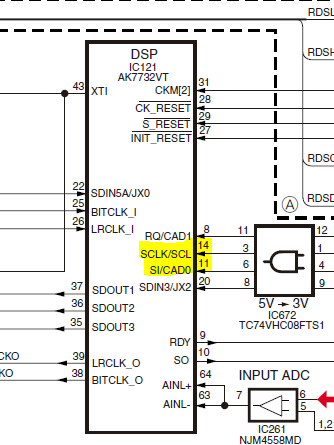 убрал резисторы со стороны магнитолы на pca9306 никаких изменений(кстати смотрел схему на +3в никаких резисторов, только со стороны проца по 5в по линии sda резистор на 47k на корпус). Так же читает около 1-2 сек потом данные перестают идти регулятор громкости также перестает работать. напряжения в спокойном состоянии шины(без нажатия кнопок) sda 0,1в (лог0), scl 3,2в (лог1),(при нажатии вроде что то меняется, но тестер не успевает отобразить) если отключить контакт sda то регулятор громкости начинает работать, при подключении перестает. отключение контакта scl никакой реакции т.е без изменений.