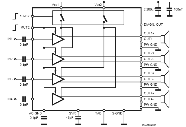 LP7313 имеет три стерео входа, коммутация которых происходит командой по шине I2C , в данном процессоре находится и эквалайзер, управляется он так же по шине I2C. С выхода аудио процессора через разделительные конденсаторы (отмеченые красным цветом) сигнал поступает на вход усилителя мощьности (TDA7381).