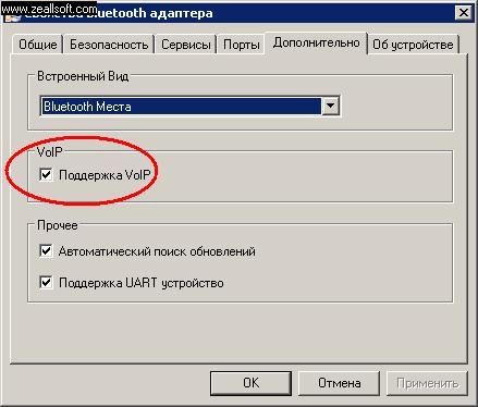 Заходим в Bluetooth-окружение. В свойствах "Мое устроуство" во вкладке "Дополнительно" отмечаем галочкой "Поддержка Voip".