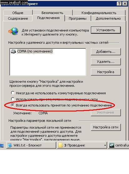 После этого заходим Пуск\Панель управления\Свойства обозревателя\Подключения. Ставим "Всегда использовать принятое по умолчанию подключение".