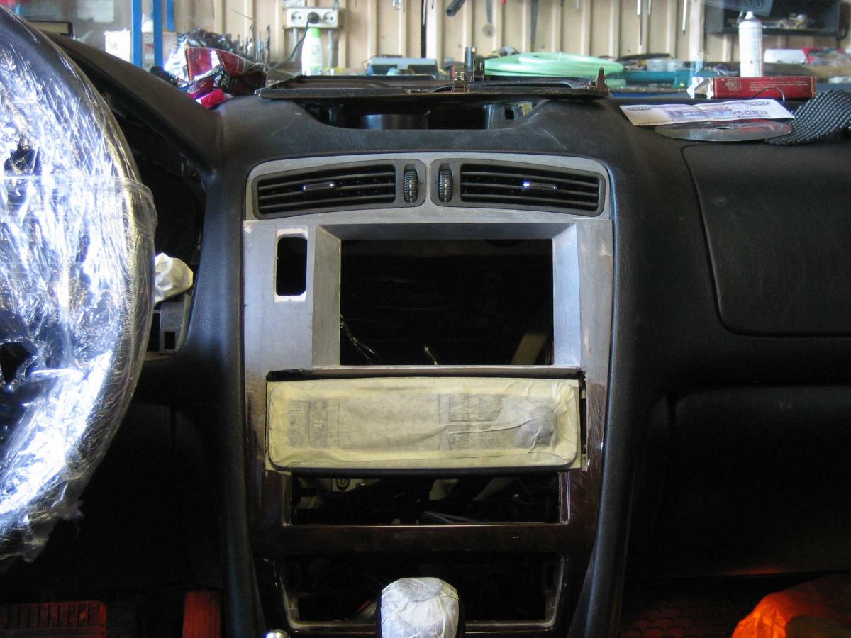 было принято решение - порушить центральную консоль напрочь. должны будут жить - монитор, блок управления климатом, ГУ - Накамичи MB-X(музыка уже была установлена), пепельница, кармашек для сигарет/зажигалки. В родную консоль все это вместе не помещалось - были принесены в жертву "родные" центральные дефлекторы отопителя (слишком здоровые были)- вместо них вживлены от MB221 из центральных стоек - для задних пассажиров. соответственно - кнопка аварийки "переехала" левее и ниже - слева от монитора. родная пепельница была заменена на другую - от нового Авенсиса - с микролифтом. для дефлекторов был изготовлен переходник из фанеры и "волосатки" - размеры и углы штатных воздуховодов и новых дефлекторов не совпадают в принципе. накладка центральной консоли и на "автомат" - а-ля "под дерево" - были порушены и построена единая целая деталь. в 3-ей "редакции" (первые две были неудачными) - блок климата, ГУ и новая пепельница - жестко закреплены в "бороде", моник (матрица извлечена из корпуса) интегрирован в верхнюю часть накладки. слева - кнопка "аварийки", под ней кнопка вкл/выкл монитора, светодиод вкл/выкл монитора (пока отсутствует), ИК-глаз монитора - все настройки моника только с пульта.