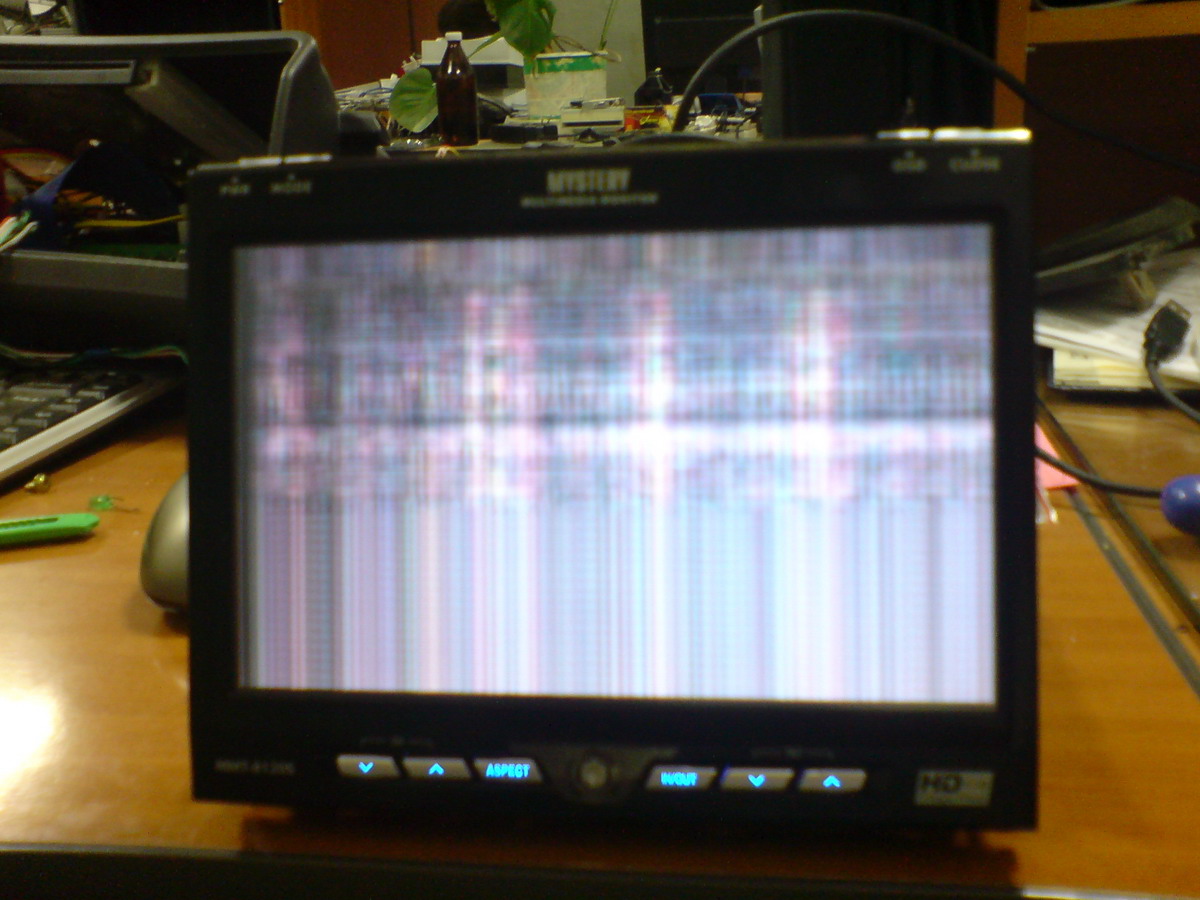 Привет. Ситуация в следующем, комп выключил и не включал недели две где то, всё было нормально. Сегодня включил - монитор показывает вот такую хрень. Иногда видно часть рабочего стола гдето кусок справа весь в полосах. Подключил другой монитор всё путём показывает. Подключил Мистери к другому компьютеру такие же кракозяблы. Чего может быть??? Заранее спасибо за помощь.