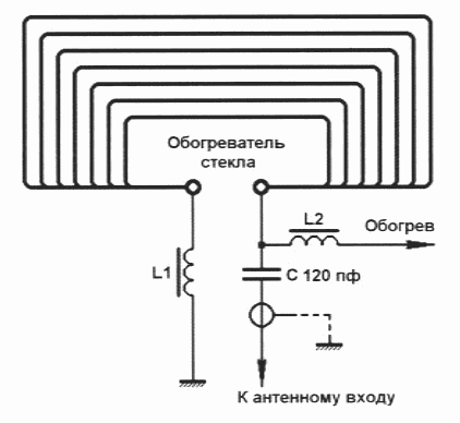 Однако можно пойти другим путем - использовать в качестве антенны элементы обогревателя заднего стекла. Этот метод, кстати, с успехом применяется штатно во многих зарубежных автомобилях - в городских условиях качество приема отличное. Необходимые доработки минимальны: в цепи питания обогревателя нужно установить радиочастотный фильтр. Это два дросселя, “отсекающих” путь высокочастотным сигналам в бортовую сеть автомобиля, и конденсатор, пропускающий их к приемнику.