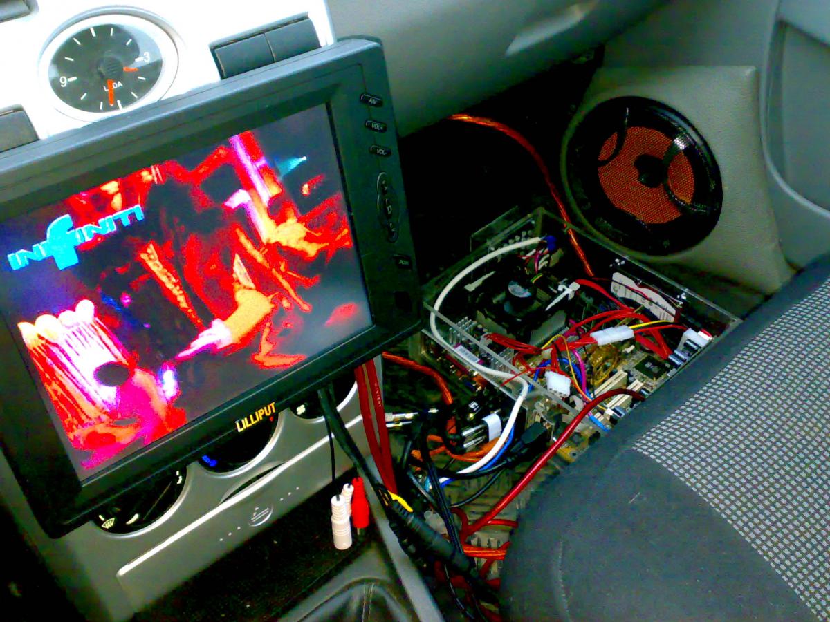 системник убрал под водительское сидения . Теперь осталось самое главнное врезать монитор в торпеду, на чем я пока и остановился, думаю покатаюсь чтоб комп выдержал все морозные дни , езжу уже неделю все работает на УРА ,утром только когда -25 давит комп не включаеться жесткий замерзает но мин 10 поездил машина прогрелась и смело можно включать,но это не так страшно не вседа ведь мороз давит.Пока все стоит вот так