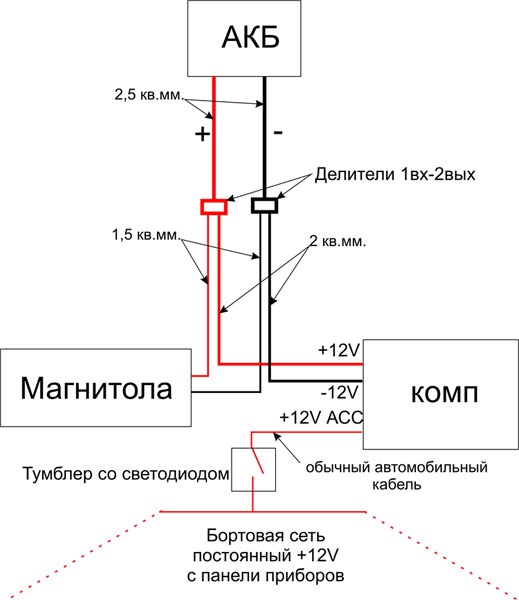 Stasik, знаю что надоел, но у меня все сделано, комп настроен и пр., осталось правильно подключить, знаю что уже туплю по-черному, но не могу спать пока не разберусь. Помогите ради бога. Вот попытаюсь изложить как я понял на сей момент и как сделал бы, скажите что правильно а что нет. У нас есть специализированный магазин по акустике, правда не автомобильный, но там есть кабели разные. Бегу туда, беру одножильный кабель сечением 2,5 кв.мм. нужной длины, так как силовых линий получается 2, то около 4 метров. Тяну от АКБ "+" и "-" под панель. На "+" и "-" ставлю делители. С делителей "+" и "-" кабелем 1,5 кв.мм. подаю напрямую на магнитолу (нет у меня сабов, усилителей и прочего, бюджет уже превышен, как бы жена не выгнала нафиг за растраты), если захочется без компа погонять скажем диск или радио - магнитола будет работать всегда, даже при отключенном РС. Далее с делителей кабелем допустим 2 кв.мм. подаю "+" и "-" на "+" и "-" БП компа. Конфигурирую БП с помощью перемычек допустим в режим Р1. Остается неподключенным +АСС БП. Тут дальше начинается у меня мрак. Как я понял, подведенные и расключенные "+" и "-" будут "силовыми", а вот +АСС можно взять к примеру из жгута прибороной панели, у меня там есть один постоянный "+", который не отключается при выключении зажигания. Он расключен к приборке VDO и служит ей питанием для сохранения суточного пробега. Вот, беру отвод этого плюса обычным автомобильным кабелем, тяну к панели тумблеров, подключаю в его разрыв тумблер и возвращаю этот кабель на БП компа, подключая на +АСС. Если я правильно понял, этот кабель не будет под нагрузкой, и сечения обыкновенного автомобильного провода из комплекта проводки будет достаточно. Теперь как все это будет работать. Сел в машину, клацнул тумблер - через 5 секунд комп запустился, в этот момент получается на +АСС БП компа постоянно идет +12V. Тумблер выключил, +12V на +АСС пропали, БП в соответствии с режимом Р1 в течение 5 секунд послал сигнал на мать на отключение, предоставил 1 минуту для завершения работы винды и отключил питание. Я правильно все понял? Не хотелось бы спалить что-то. Еще небольшая заморочка у меня с моником. Взял CTF846-ML 8", у него питание от адаптера прикуривателя, номиналов на этом адаптере нет, на сетевом адаптере стоит Output: 12VDC/1.5A. Можно ли его запитать от БП компа и как это сделать правильно? С сечениями проводов еще тоже не могу разобраться какие поставить, реально сам системник CarPC Tracer D510, к нему будет подключена веб-камера Logitech HD Pro Webcam C910, GPS Датчик LS23030, иногда переносной винт USB или флешки. Другого в обозримом будущем не вижу. И не совсем ясно с предохранителями, ставить или нет и какие, каждый говорит по своему, я уже растерялся. Вроде все изложил подробно, помогите уже закончить, вторую неделю на разобранной машине езжу, уже устал и морально и физически, можно конечно отогнать чтобы все сделали, но привык во все вникать сам и делать сам, чтобы потом знать что и к чему.
