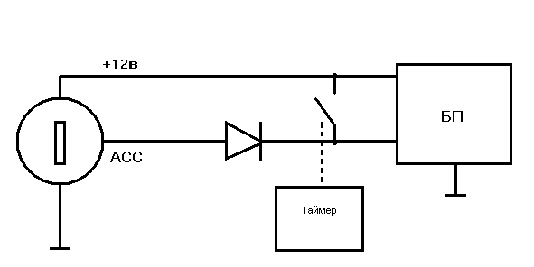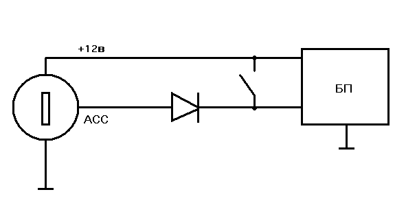 Вот простой вариант на выключателе. Для того чтобы можно было выйти из машины на несколько минут и не ждать перезагрузки компа.