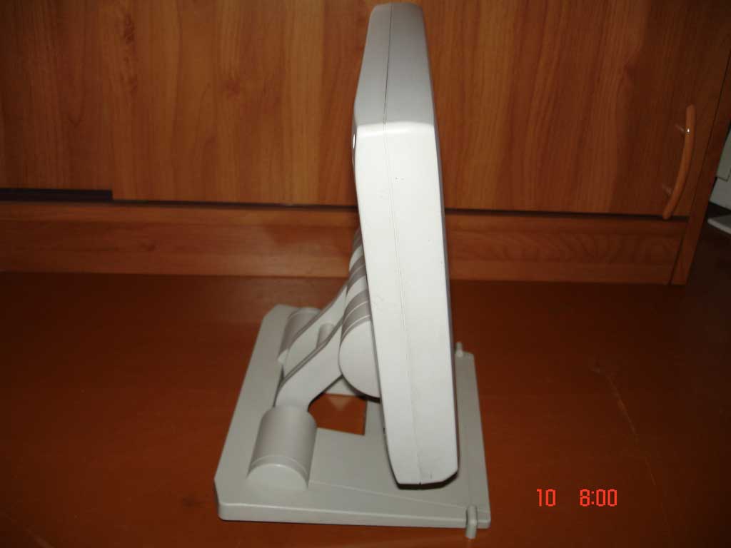 Питание от 12В, адаптер на 220В в комплекте. Подставка съемная можно прилепить куда-нибудь сам экран. В левом верхнем углу, вплотную к нерабочей области, постоянно горит один розовый пиксел, в принципе не раздражает.