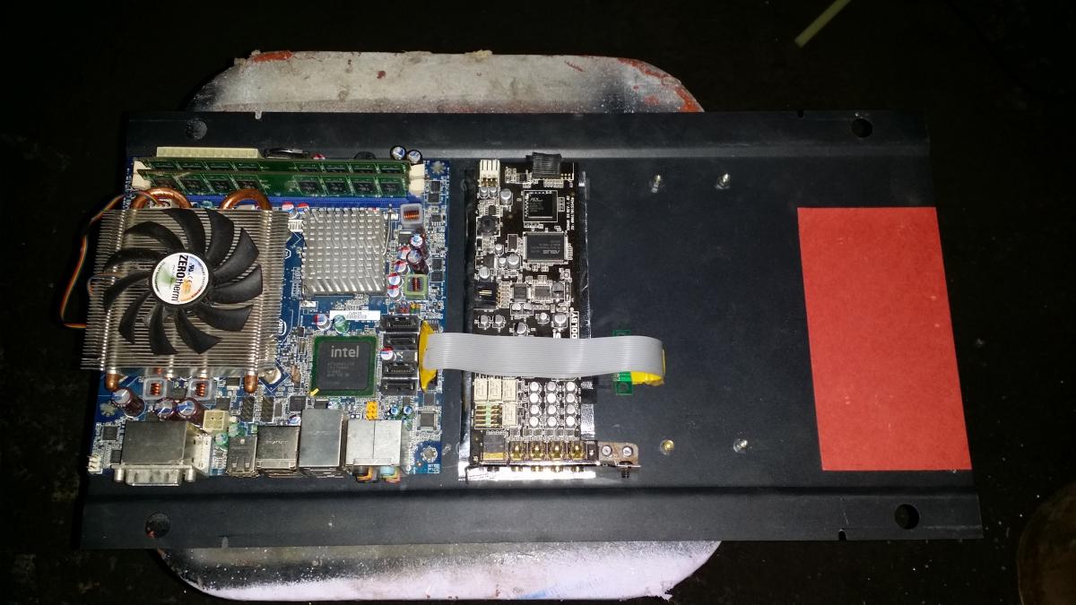 Получилось без мониторная система. Комп - медиа-сервер )). Проложено силовое кабло от АКБ до багажника аж 8ГА от "шмистари"... ну не было другого на скорую руку. Комп теперь разместился в фальш полу. За основу взята крышка от сгоревшего давно усилка. Спаял новые короткие межблоки от усилков до компа. Межблоки от ГУ оставил не тронутыми... ну мало ли, на случай сдыхания компа можно быстренько скоммутировать межблоки от гу до усилков и продолжить путь с музычкой ))