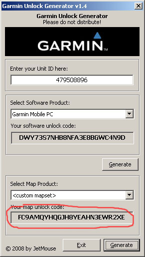 8) Вписываем цифирки с клочка бумажки в поле Enter your Unit ID here: , выбираем Garmin Mobile PC и жмем верхнюю кнопку Generate. Результат отмечен зеленым DWY73S7NHB8NFA3E8BGWC4N9D (у вас все это будет свое...)
