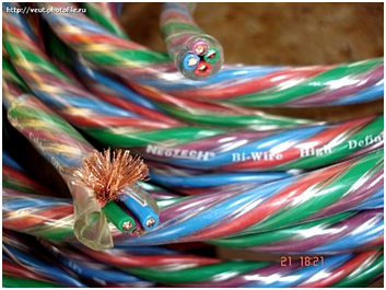 Вот еще одна классика по акустическим проводам. Витые счетверенные. Удобно тянуть при разнесенке.. одна пара на мид-другая на пищалку)) И обратите внимание сколько мелких проводов в одной жиле..Не сосчитать и они все сплетены в маленькие косички и те в свою очередь в более крупные!! В результате суммарная площадь поверхности кабеля очень большая, а это как мы знаем благотворно влияет на качество звука.. Ток же бежит по поверхности и когда проспект широкий и многорядный то и пробок нет.
