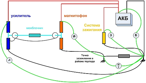 А здесь правильно землится "система зажигания"? Если сравнивать с предидущим рисунком то получается необходимо править штатную проводку? В идеале да! Это касаемо в основном моторного отсека. Тогда уж в идеале дотянуть землю магнитолы до земли аккумулятора, и избавится от Ш3. Это куда проще, чем перелопачивать землю всей штатной электрики.