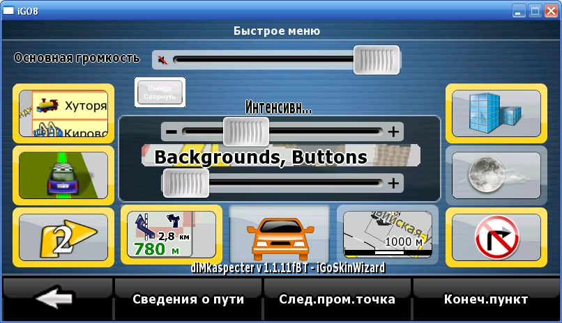 1) Зайти в меню Настройки->Меню->Оформление и выбрать скин "diMkaspecter v 1.1.11fBT - iGoSkinWizard"