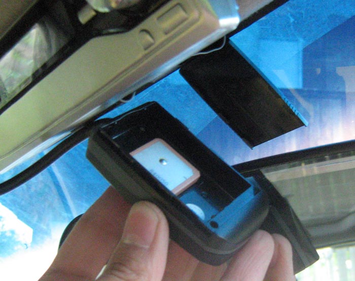 приемник приклеен на лобовое стекло, за зеркалом.