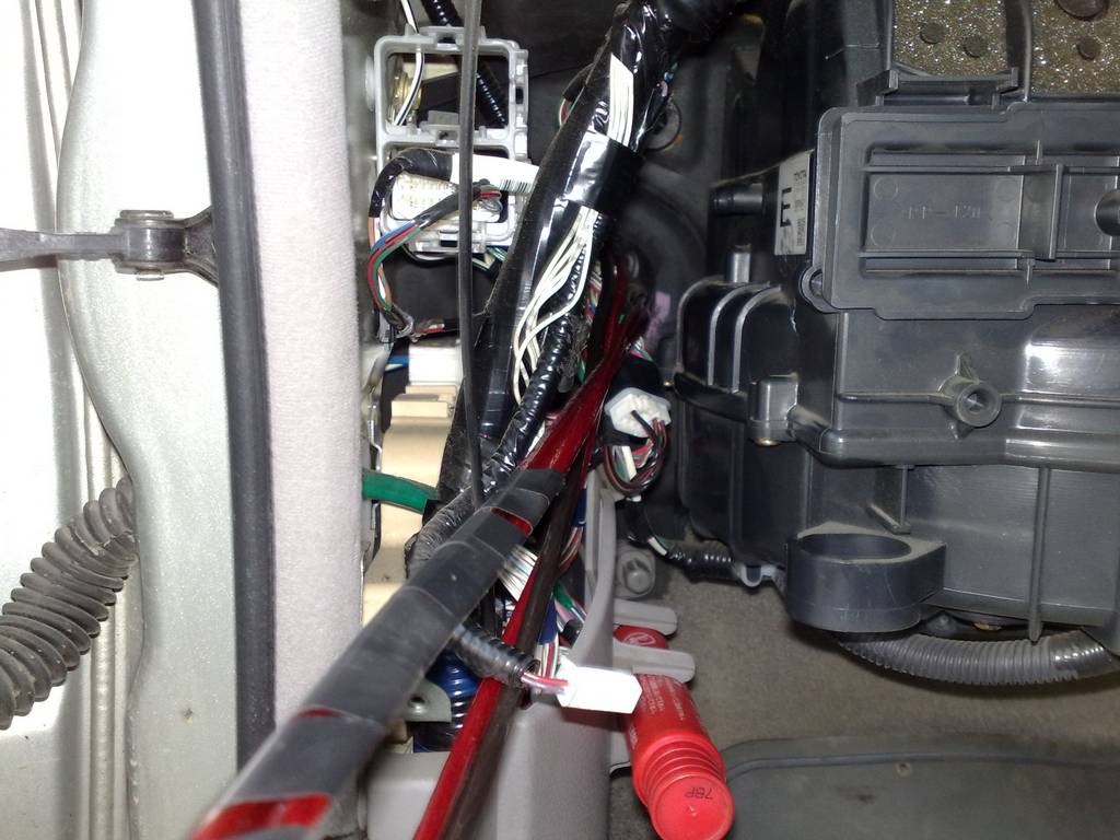 Протянул силовые провода, а так же левый передний канал. Тянул сразу за акумом, там очень удобное тех. отверстие, далее по порогу(где места еще очень и очень много) и за сиденьями в багажник.
