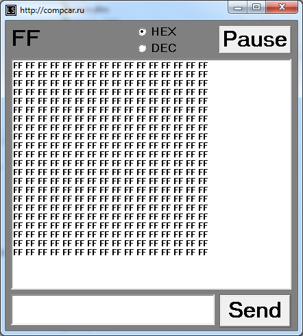 Можно выбрать режим отображения и отправки в Hex или Dec