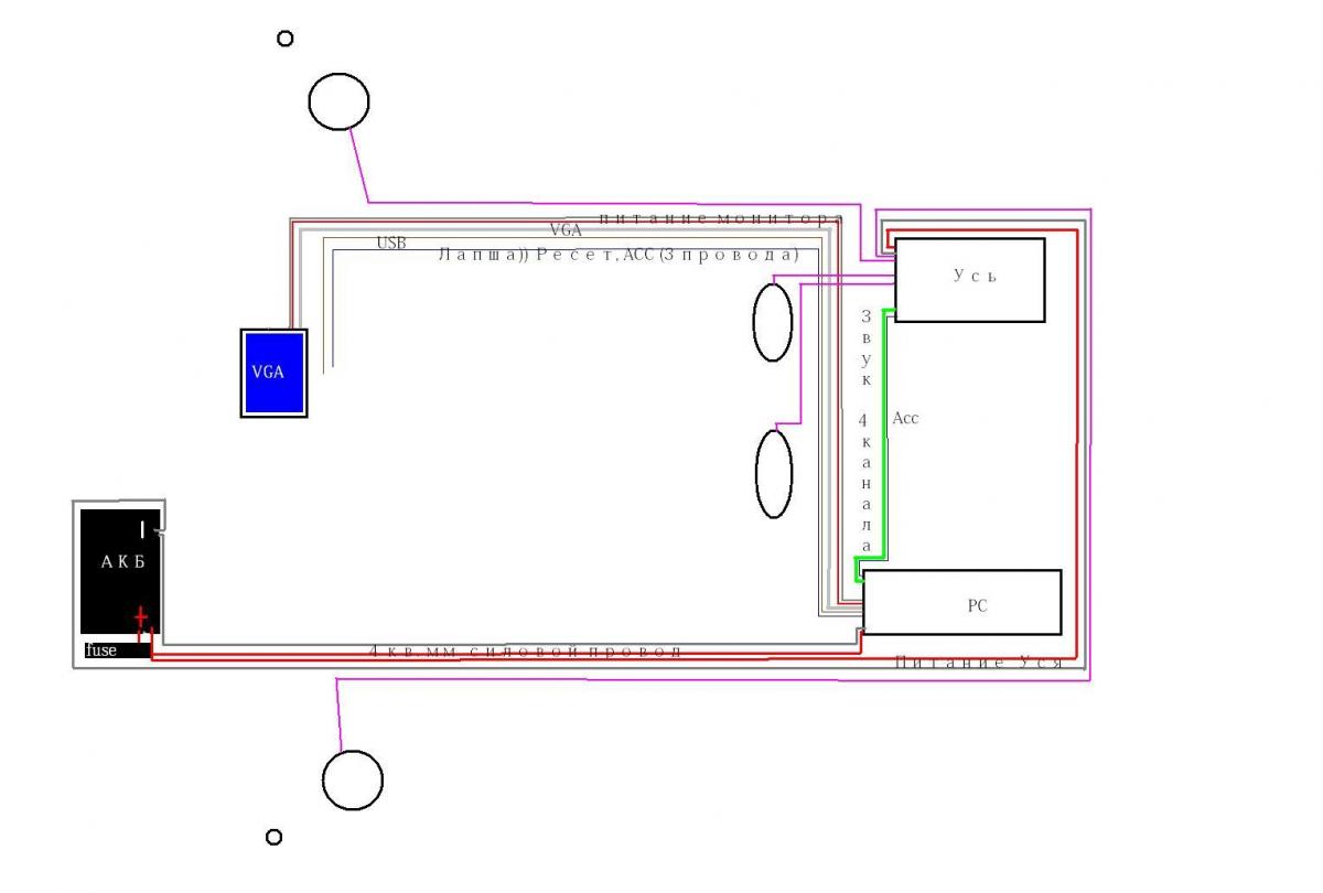 Ниже я выложил схему подключения карпутера, по левому борту хочу тянуть только силовые кабели их 4 штуки - 2 плюса и 2 минуса(отдельно для карпутера, отдельной для усей)(+1 провод для левого переднего канала от усилителя), по правому все остальные провода(USB, VGA, ресет, Acc, питание монитора, правый передний канал).