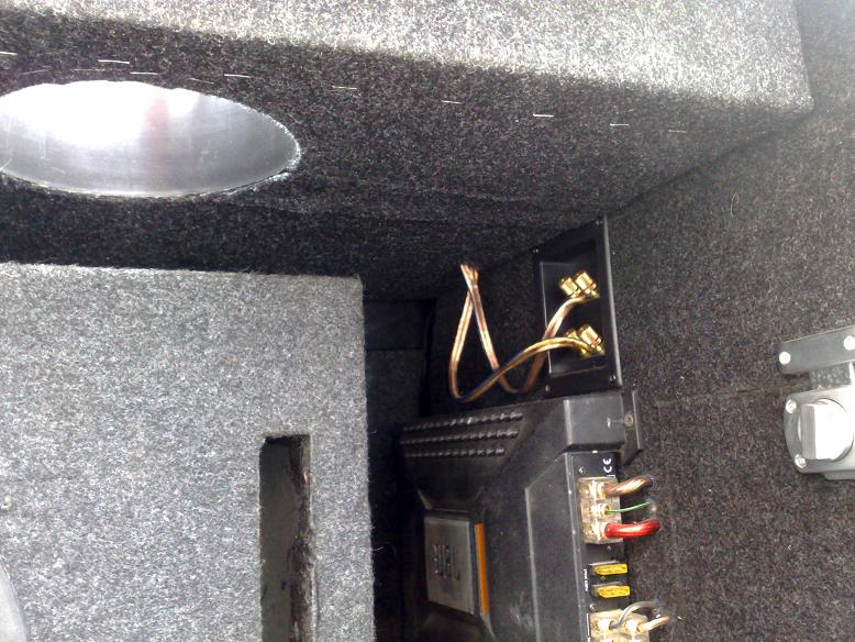 Блок питания М4-АТХ на задней части крыла(включает и выключает от зажигания монитор, хаб и три усилителя(два четырехканальных фронт-тыл и двухканальный на саб), на фанерке.