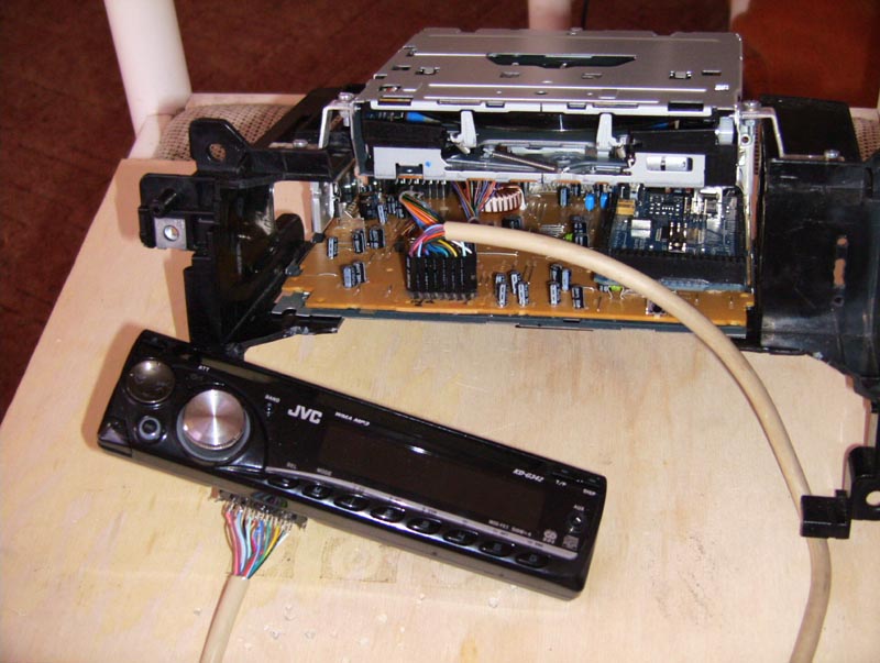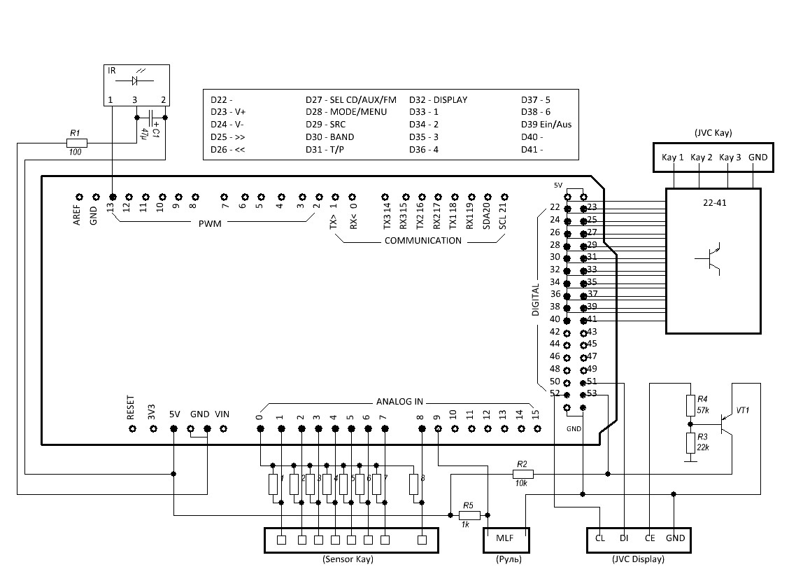 Все прошивки по отдельности проверенны теперь буду все это склеивать воедино. План таков: 1. сделать управление с сенсорных кнопок (8 кнопок по бокам монитора) основными функциями магнитолы JVC. 2. продублировать управление сенсорными кнопками резистивными кнопками с руля. 3. при активации AUX а тем самым звука с компьютера резистивные кнопки с руля должны управлять компом. IR Пульт для управления компом и вывод данных дисплея JVC на монитор компа.