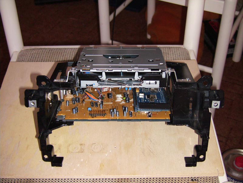 Взял оригинальную раму на которой крепиться управление климатом и магнитола от такой же машины. Магнитолу разобрал, раму подпилил. выпаял разем от морды магнитолы и впаял штырьки для подключения к Arduino (пока подключил морду с удлинителем пока не доделал плату для Arduino . CD привод поднял выше и распаял удлинитель для разема. рядом с платой магнитолы встанет Arduino, плата с питанием +5в, плата управления магнитолой через Arduino и USB хаб. CD будет выходить над монитором через щель в рамке, рамку еще не доделал. пойду щас примерять все в машину и снимать точные размеры для рамки.