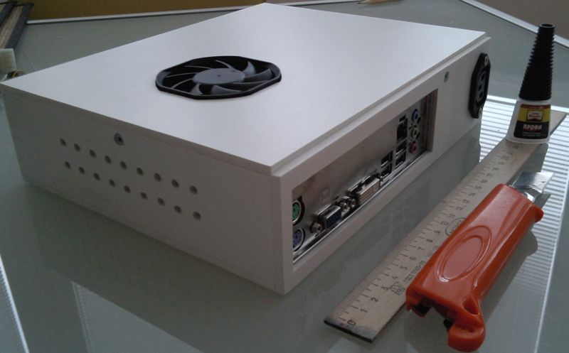 Используя материнку m-ATX, корпус получлся размером 26 х 21.5 х 6.5 . Толщина пластика 5мм.