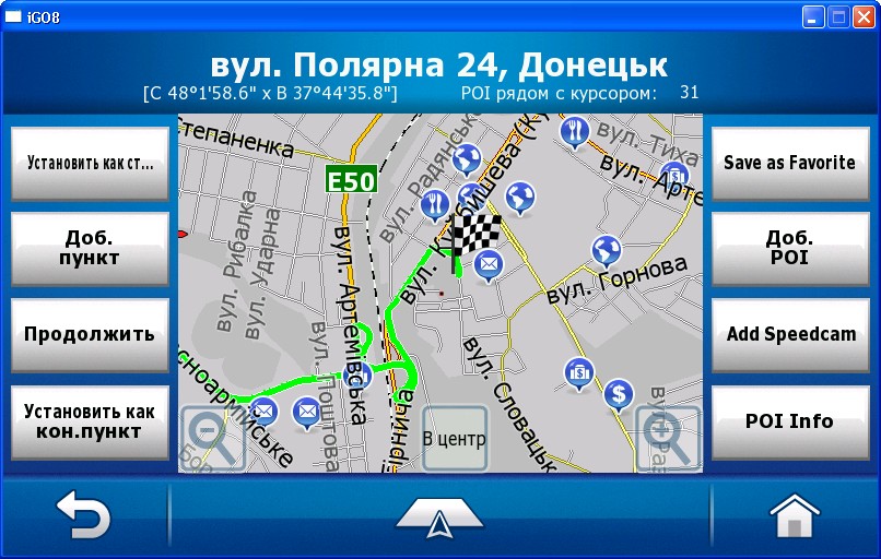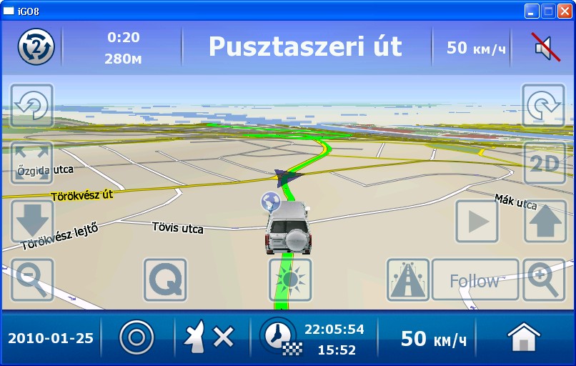 2. Не понравилось, как прога со скином отрабатывает проезд круговых развязок. При подъезде к кругу картинка застывает в одном положении, курсор положения вылезает из-под машинки, начинает движение по кругу, и только при выезде с круга вид экрана опять приобретает нормальное состояние. При этом у меня отключено автоматическое приближение перекрестков при их проезде (значения смартзума стоят одинаковые для мин и макс), что на обычных развязках позаоляет окидывать их взглядом целиком и это удобно, а на круговых наоборот, создает определенные трудности при их проезде. На версии iGO83 для КПК у меня эта проблема решена, а вот попытка применить теже настройки в sys_pc.txt для версии iGO для РС пока не привели к успеху. Буду разбираться.