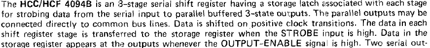 Походу я накосячил. Подрубил 2 штуки HCF4094BE для того, чтобы увеличить кол-во вЫходов. А он оказался ShiftIn а не ShiftOut регистр.