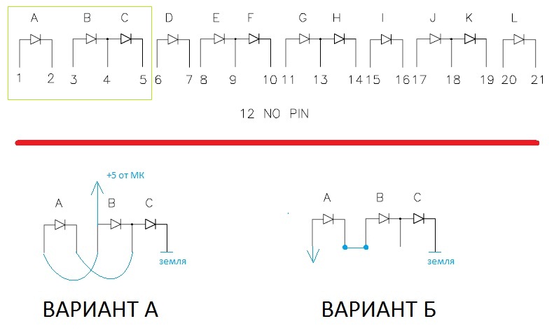 Вариант А работает, но светодиоды святят разной яркостью.