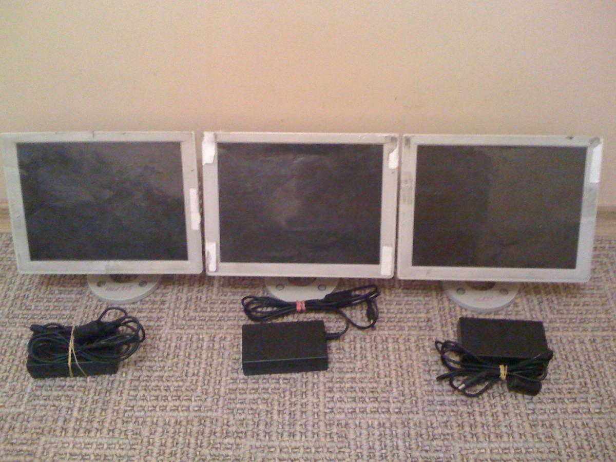 Продам 3 одинаковых монитора, все на фото, либо задавайте вопросы, моники б/у, но на каждом еще сохранилась пленка, тосесть экраны не покоцанны, пластик местами загрязнился, ко всем есть бп, кабелей vga нет, вход только vga, хотелось бы 5000р за все.