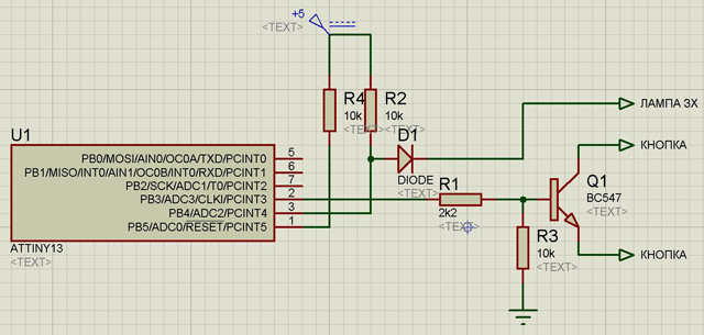 Данная схема рассчитана на работу от лампочки заднего хода, то есть когда задняя скорость выключена то лампочка через спираль и далее через диод подтянет вход контроллера к земле, когда на лампочке +12в то диод заперт и и на входе контроллера за счет внутренней подтяжки будет +5в