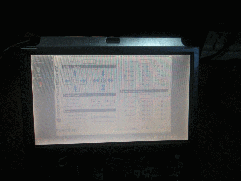 Сдравствуйте. Подключил моник от навигатора Panasonic GD50, по принцыпу RGB и два синка (V и H без смешивания), настроил поверстрипом, картинка есть, но все изобрадение как будто в повышенной яркости, цвета не насыщены, трудно разглядеть смотря прямо в моник, и лучше когда сбоку или снизу, хотя должно быть наоборот. Подпаивался непосредственно на платку контроллера TFT матрицы (благо там все подробно расписано, хотя и не все понятно что для чего), подскажите в чем трабла, может еще на какой пин припаяться для регулировки яркости? Средствами(контраст, яркость, цвет) поверстрипа пользовал не помогает фото ниже