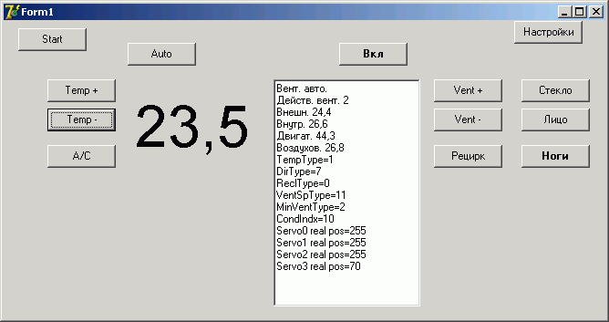 ну я еще сделал обдув стекол, чтобы стекла инеем не покрывались, пока двигатель не прогрет. Но это все уже не к прошивке относится, поскольку данные по тому когда и как дуть хранятся в eeprom и их можно менять с компьютера в спец. программе. В этой же программе можно задавать положения серв для различных направлений потоков воздуха, параметры вентилятора и прочее.