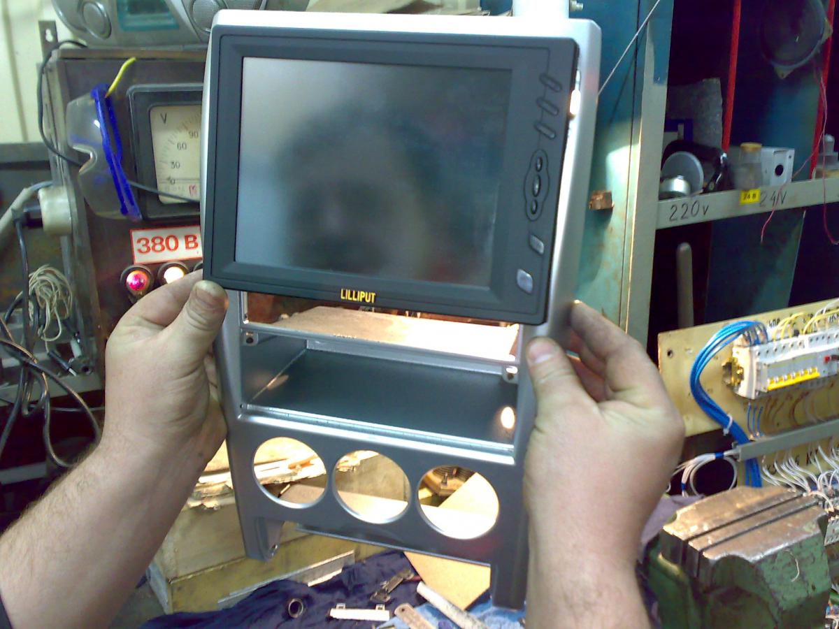 Лучше все это снять, рамку от лилипута приподнять чуть выше. Рамку и панель склеить вместе. Вырезать посадочные места под кнопки и поставить их ниже монитора. Все это срастить эпоксидкой или полиэфиркой, или еще чем нибудь. Вывести шпатлевкой и отдать мастеру на покраску.