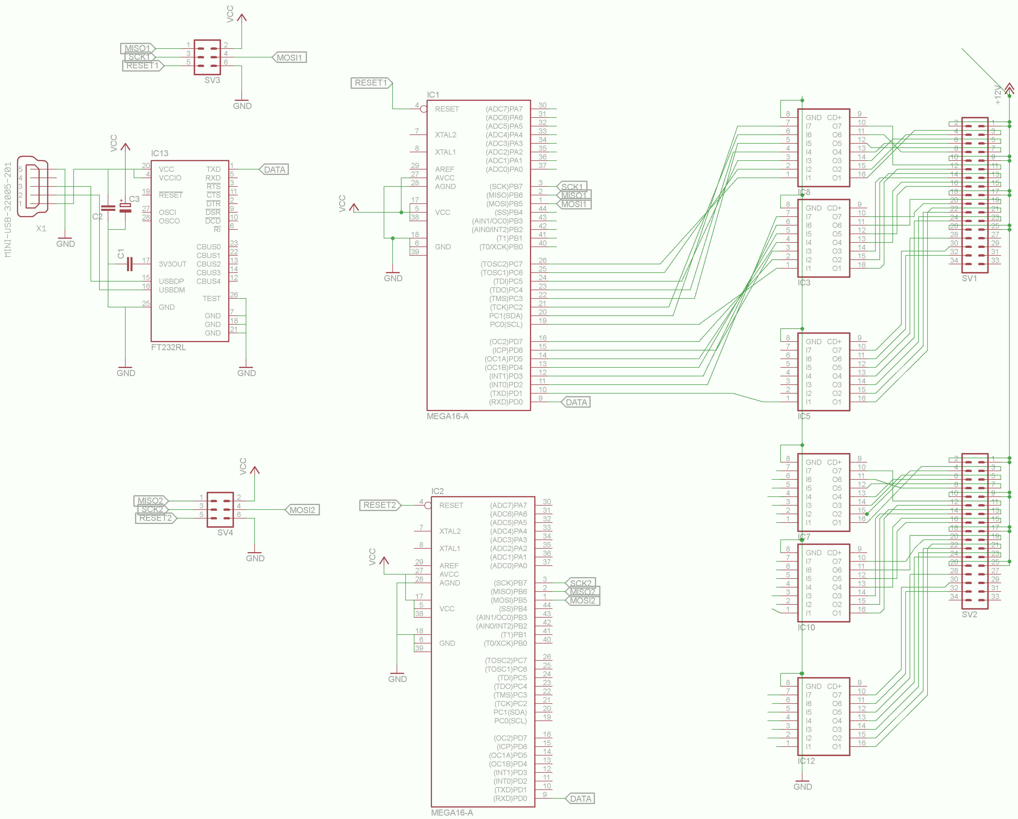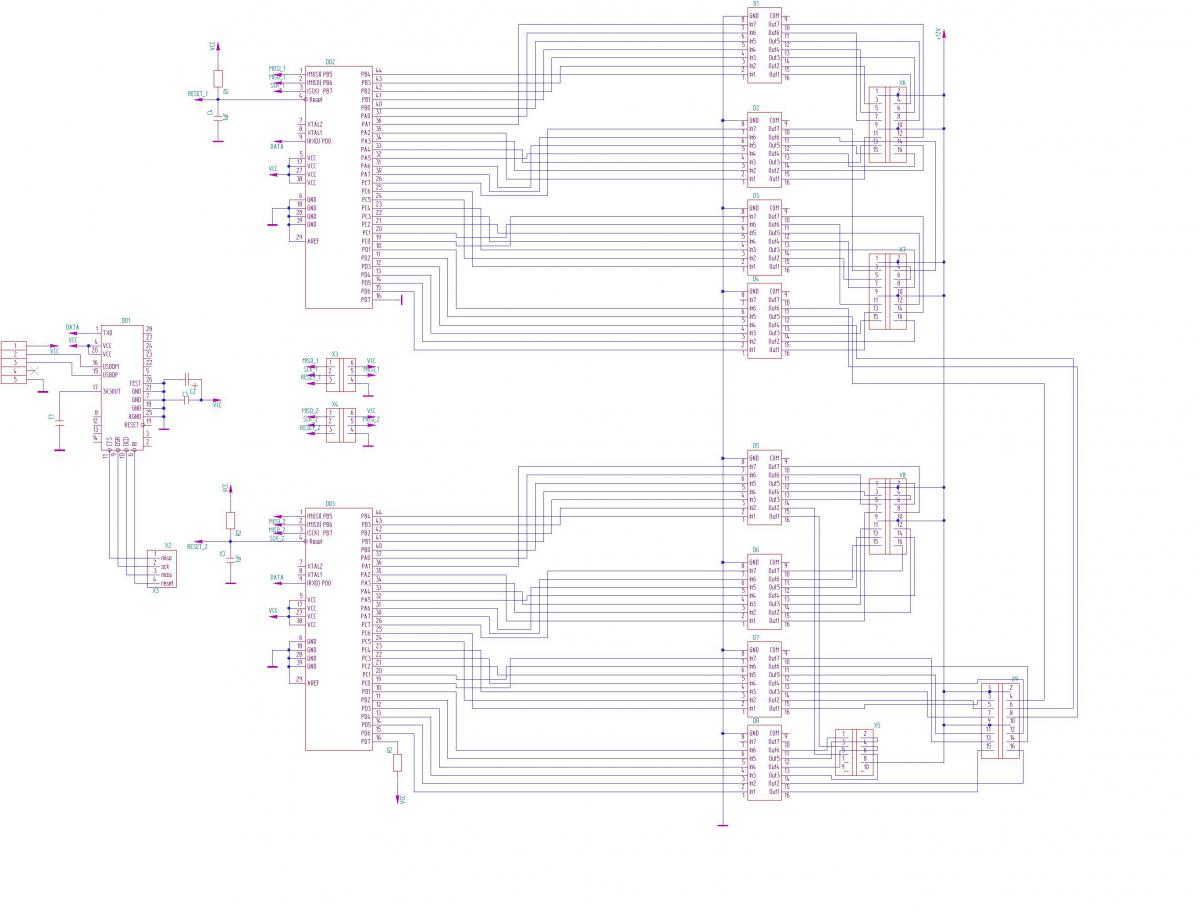 вот, пример того, как может выглядеть схема. На плате не разведено питание, но это мелочи - на схеме оно разведено и там ошибиться сложно. Очевидно, что надо будет либо двухслойку делать, либо перемычки. Каждый вывод меги общего назначения (PORTA ... PORTD), не используемый для чего-либо, может выдавать данные в uln'ки.