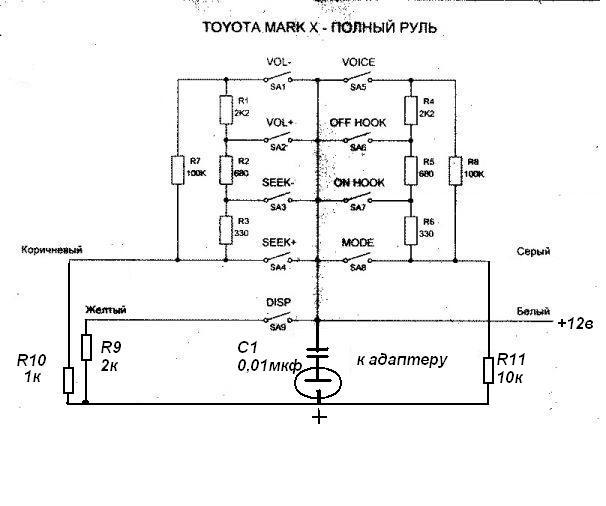 на руле два блока кнопок с лева на музыку коричневый провод, справа кнопки на телефон и пр. серый провод, ещё есть желтый который сам по себе без резисторов, и на этих блоках кнопок во первых сопротивления одинаковые а во вторых нижняя кнопка тоже без сопротивления остаётся, так что приходится химичить и вот хотел узнать нормальные ли сопротивления я придумал или лутше другие поставить чтоб не было там конфликтов какихнить или ещё чего... ну и про конденсатор как его там поставить тоже вопрос![]()