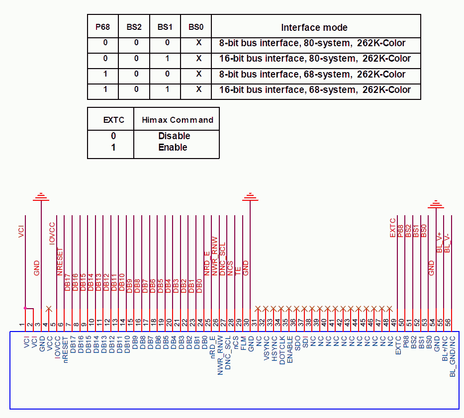 На сколько я понял - дисплей у тебя 16bit, чтобы его передалать на 8 нужно резистор R1 перенести на место резистора R2, чтобы это сделать нужно снимать дисплей, а это не просто. Поэтому подключать дисплей надо как 16bit