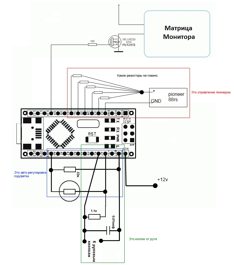 При нажатии кнопок на руле, притухает подсветка, причём определённым кнопкам соответствует определённая яркость. При заливке скетча из шапки (без доработок, как есть) картина та-же.. Пробовал кнопки перевешивать на другие порты, менять резисторы, менять фоторезистор, ничего не помогает. Может у меня что-то не так подключено ? Хелп!