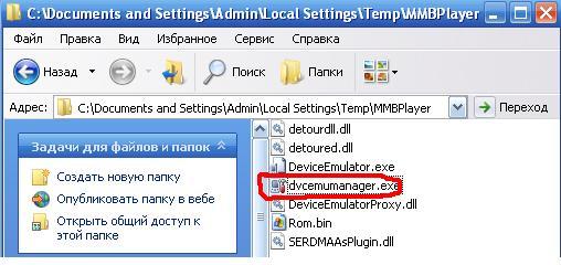 Сборка при старте создаёт папку C:\Documents and Settings\UserName\Local Settings\Temp\MMBPlayer, в которую копирует файлы, необходимые для своей работы, в том числе и dvcemumanager.exe, который запускается при нажатии на кнопку. Если в системе есть установленный Device Emulator, то и в его папке будет такой же менеджер. Который из них Вы пробовали запускать вручную?