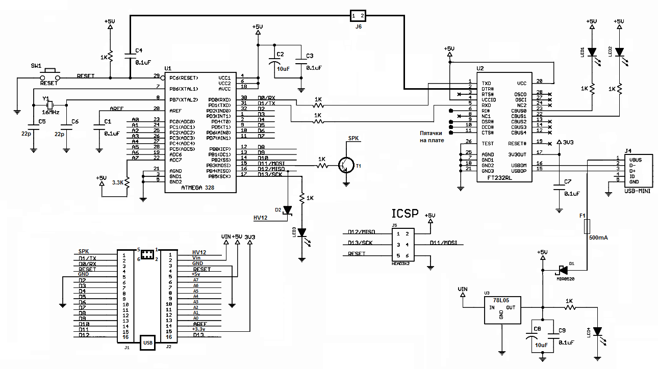 Вход HV12 подключен к пину D12 через диод Шоттки, для возможности подавать на этот вход сигнал с уровнем от +6в до +30в. Дополнительно потребуется программное подключение внутреннего подтягивающего резистора