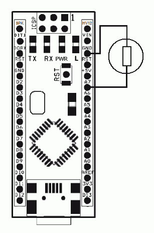 Аналоговый вход А7 на данном входе подключен подтягивающий к +5в резистор 3,3к. Резистор добавлен для того что бы можно без всякого обвеса подключать аналоговые датчики, такие как фоторезистор, терморезистор, N-P-N фототранзистор, рулевые резистивные кнопки, датчик уровня, тензодатчик, реостат и прочие датчики.