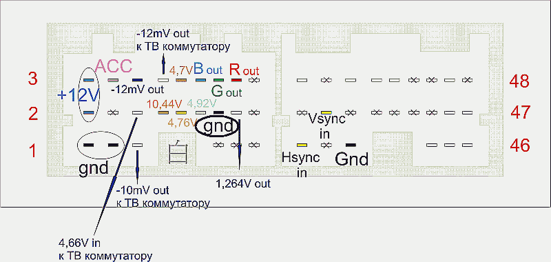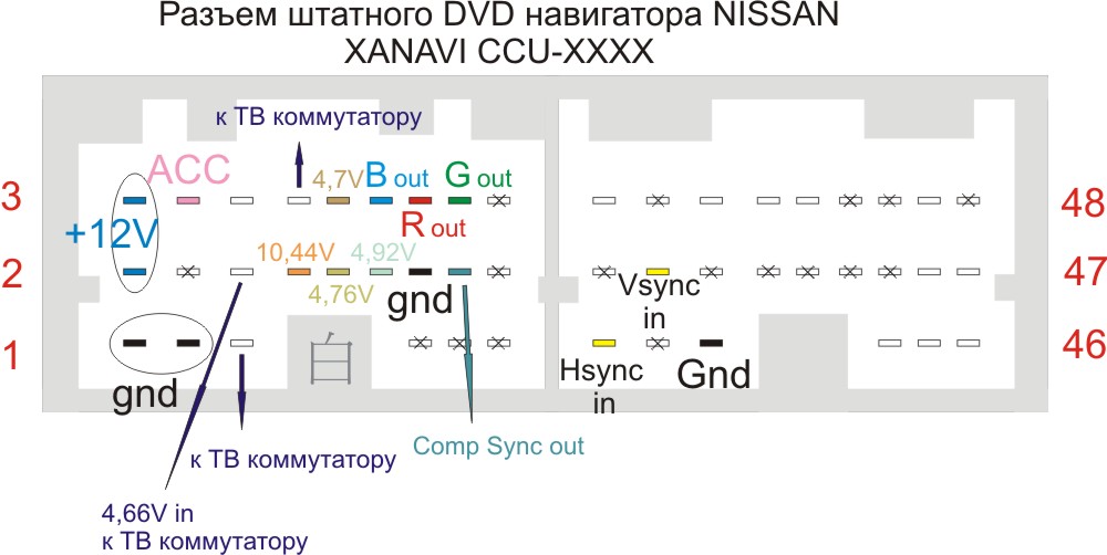 Немного подправил распиновку разъема DVD навигатора NISSAN CCU-3073V. Осталось найти контакт активирующий штатный монитор