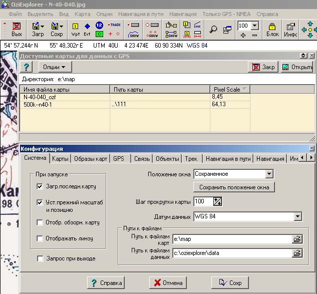 Открываю ОЗИ с картой N40-040 и при нажатии кнопки со стрелками появляется окно с двумя картами N40-040 и 500k-n40-1 Все правильно, так как первая лежит внутри второй! Теперь создаю в E:\MAP папку 111 и переношу туда оба файла 500k-n40-1 и в третьей строчке файла 500k-n40-1.map прописываю E:\MAP\111\500k-n40-1.gif и, хотя опция "только текущая папка" стояла, ОЗИ снова находит обе карты (а может быть и без записи в .map нашел бы?) Как показано на картинке! Закрываю Ози с 5-километровкой - открывается снова с 5-километровкой. Закрываю Ози с 2-километровкой - открывается снова с 2-километровкой. Ведь стоит опция загружать последнюю карту.
